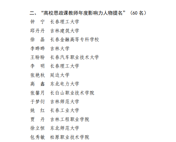 根据《关于开展2024年吉林省“高校思政课教师年度影响力人物”推选展示活动的通知》,经学校推荐、专家评审,评选出吉林省“高校思政课教师年度影响力人物”10人、“高校思政课教师年度影响力人物提名”60人,现将评选结果予以公示。公示期为2024年12月23日至2024年12月27日。